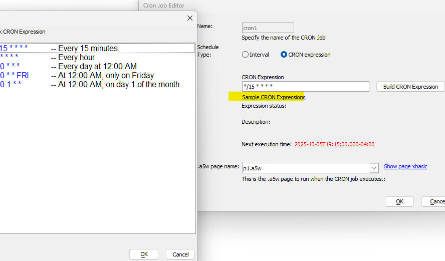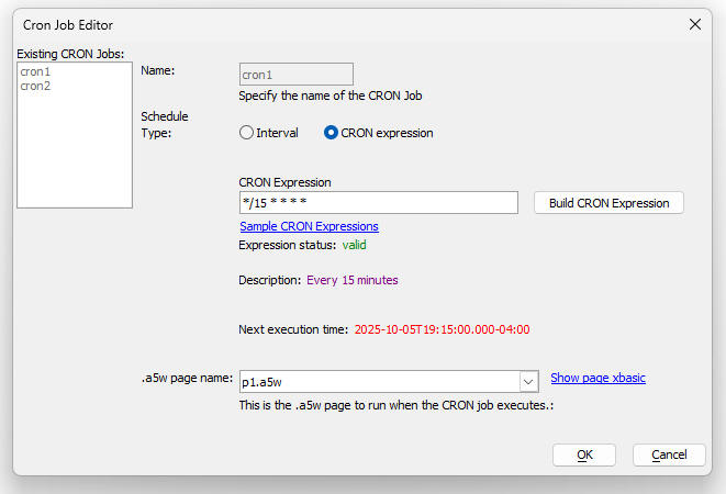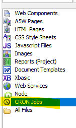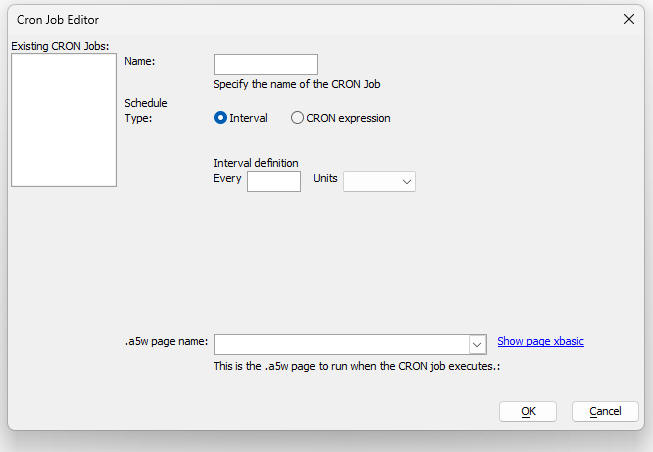 For each CRON job that you define, you must specify that name of the .a5w page to run when the CRON job runs. The .a5w page should contain an Xbasic code block.