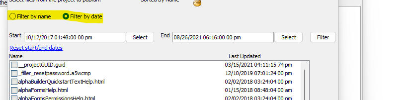 Publish - Select Files by Date - When selecting files to publish, you can now filter the list of available files by date/time