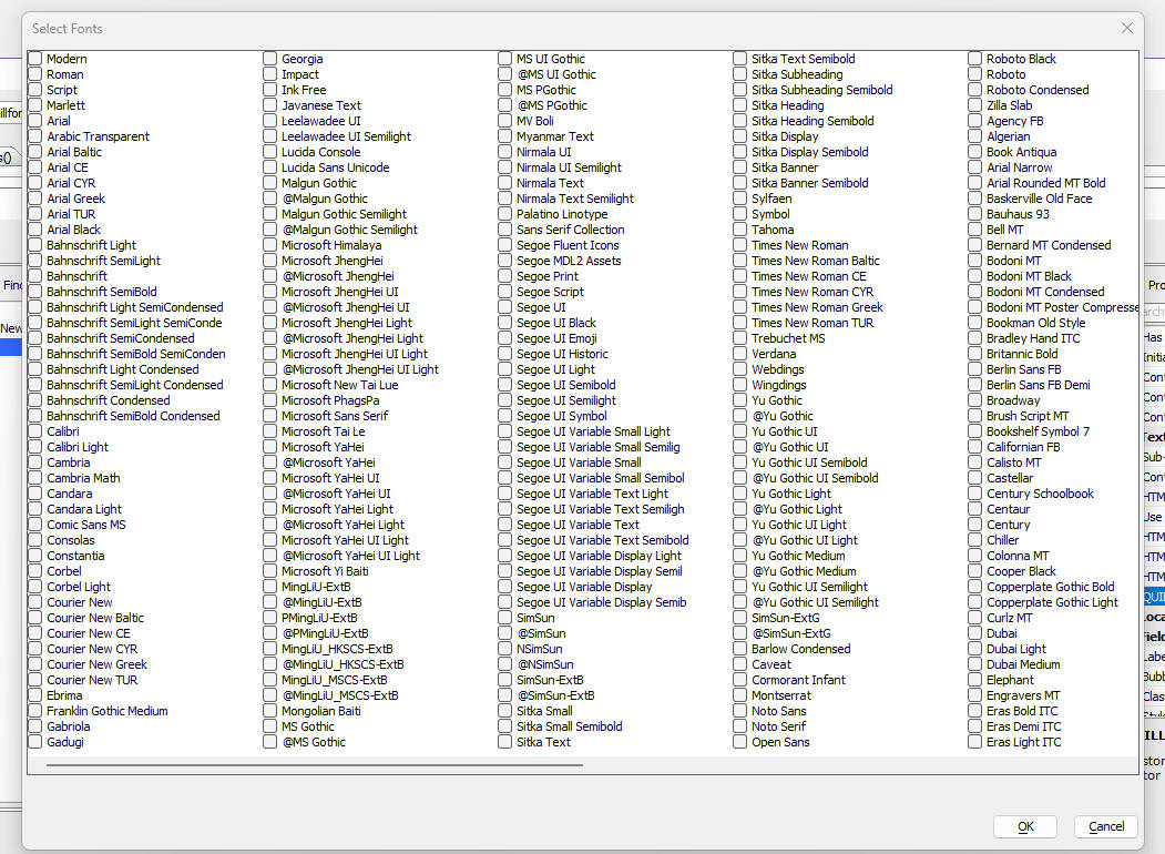 To customize the available fonts click the smart field for the HTML editor fonts property.