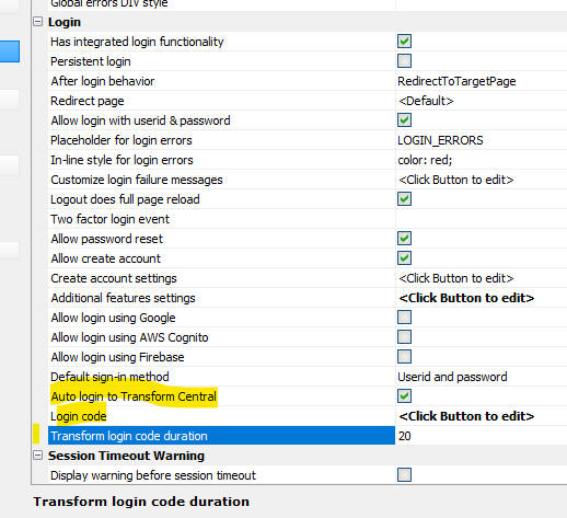 The Transform login code duration property defines the amount of time within which the user must log into Transform after logging into the Alpha Anywhere application. Once the login code has expired, the user will have to log into Transform by supplying their credentials.